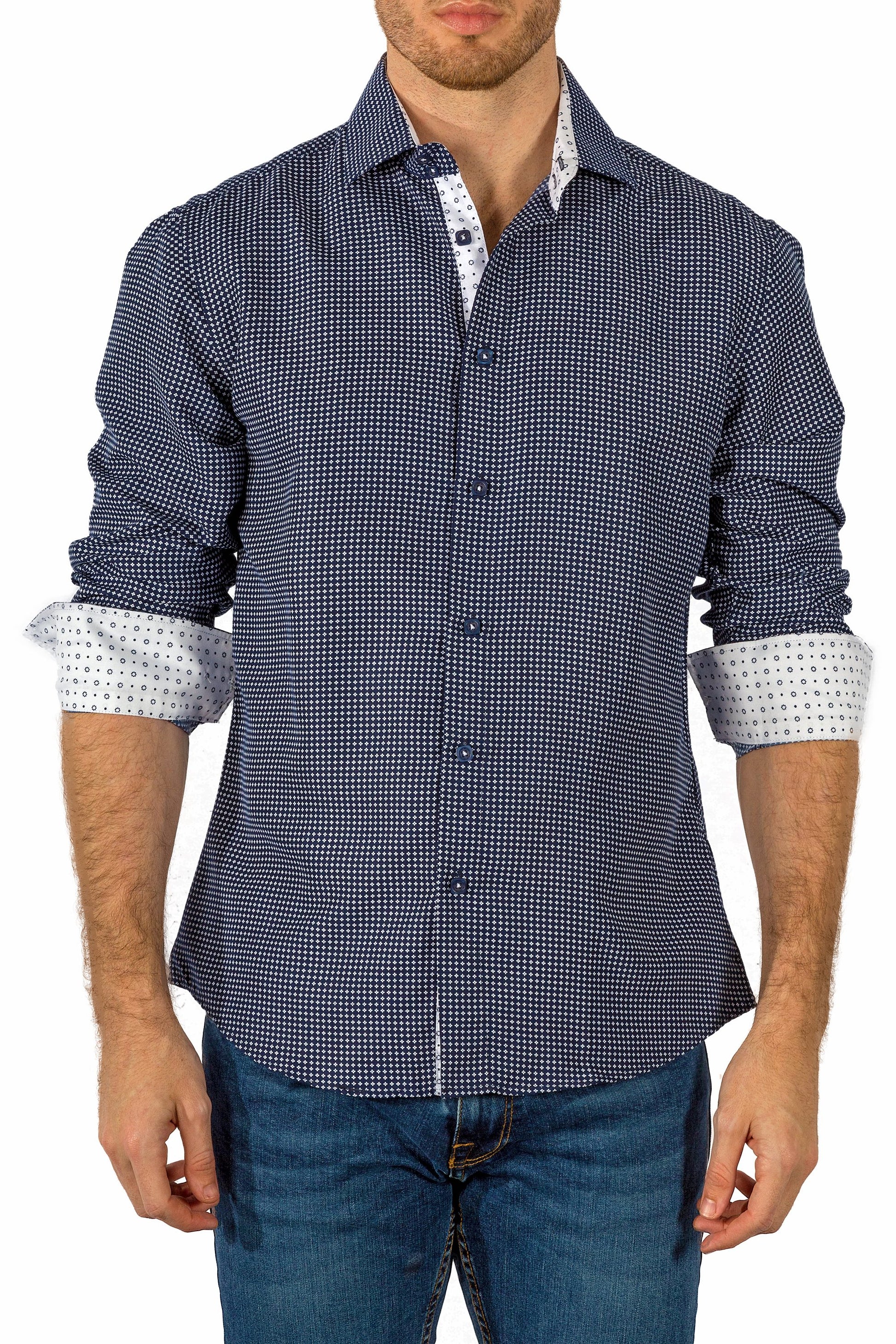 - White & Navy Diamond Geometric Microprint Long Sleeve