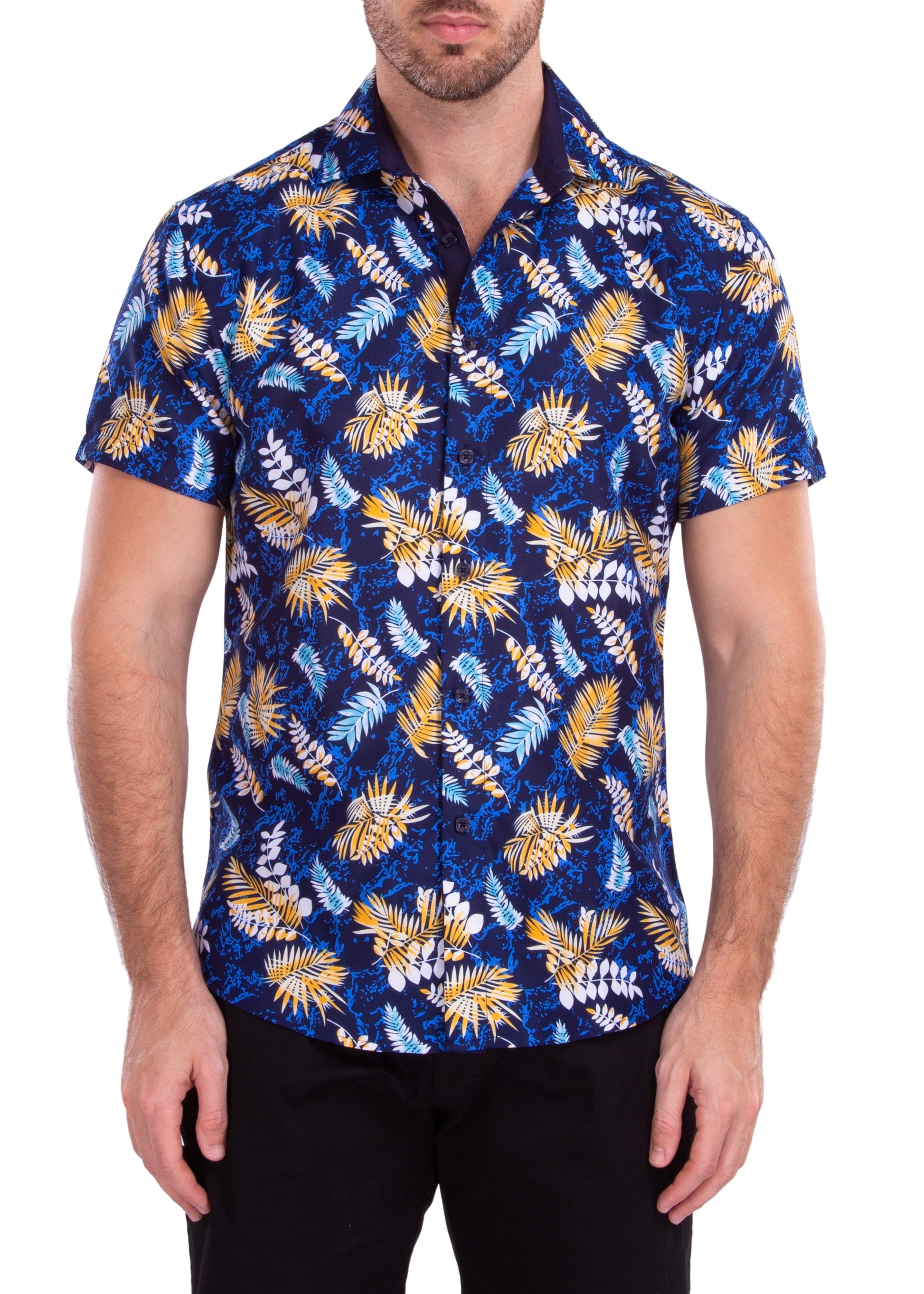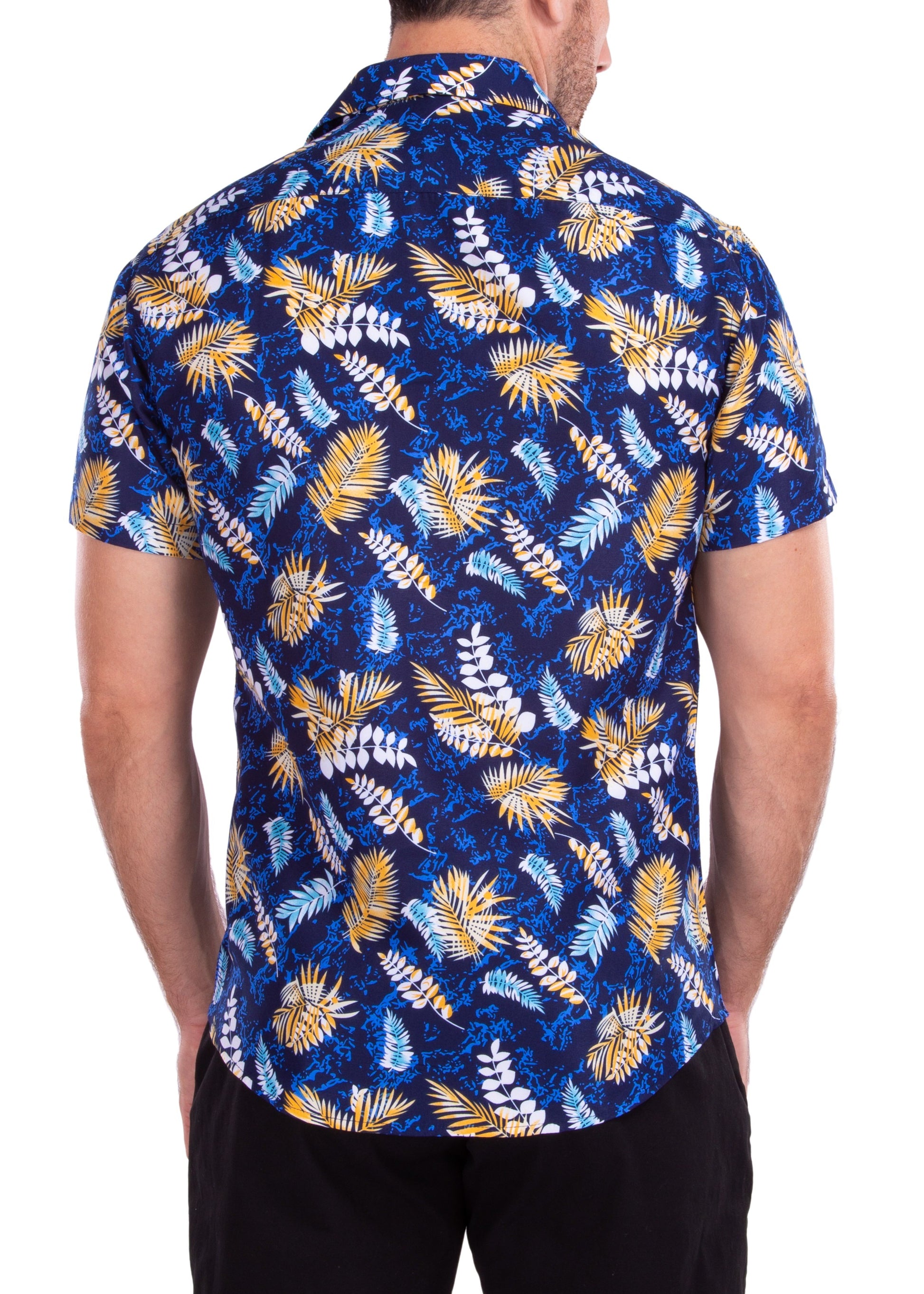 - Vintage Multicolored Palms Hawaiian Print Short Sleeve