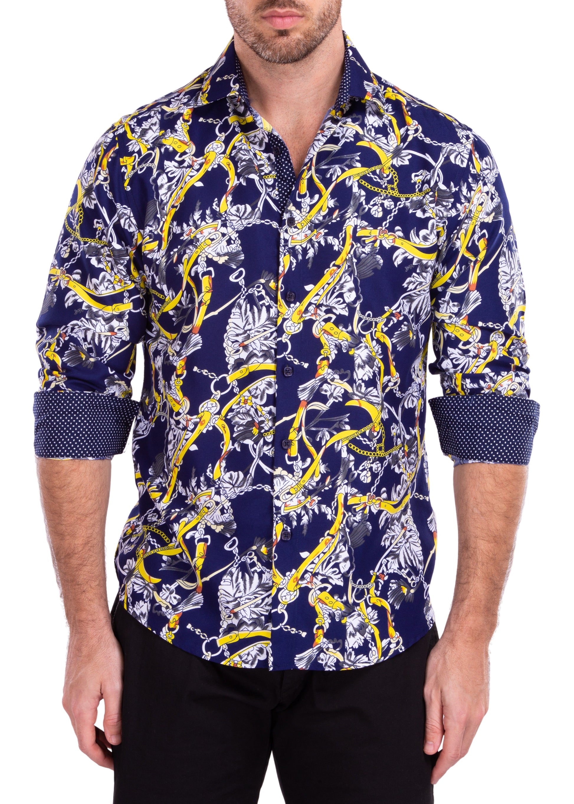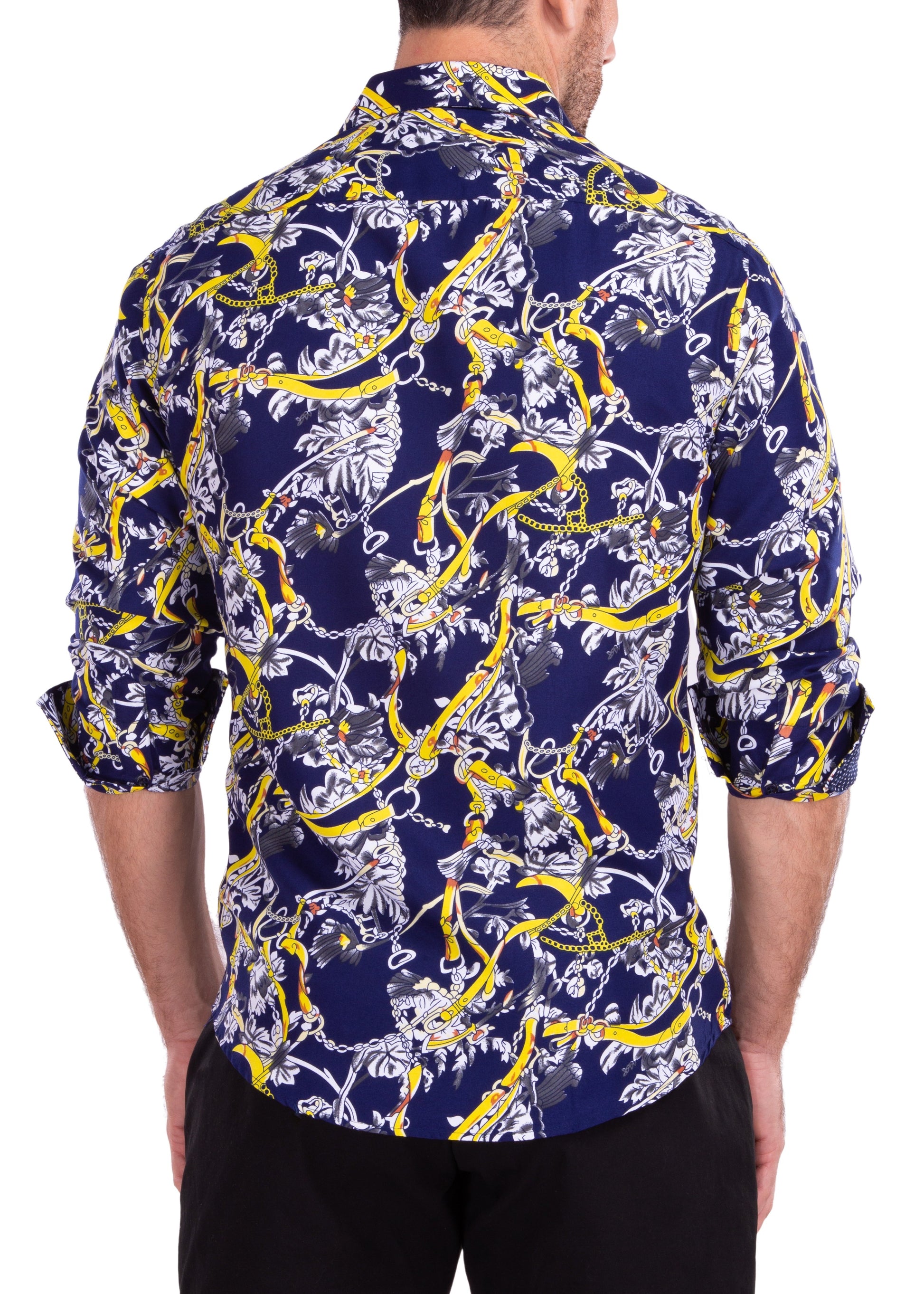 - Abstract Vintage Leather Belts, Gold Chains, Tassels, Colorful & Bold Printed Long Sleeve